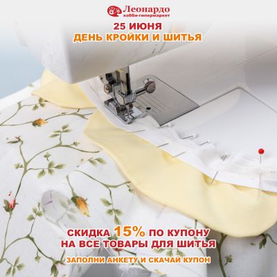 Чтобы поздравить рукодельное сообщество с Днем кройки и шитья, «Леонардо» дарит праздничную скидку 15% на ВСЕ товары для шитья, включая оверлоки и швейные машины. Скачивайте купон заранее, а 25 июня приходите и покупайте самые желанные подарки для швей и портных!